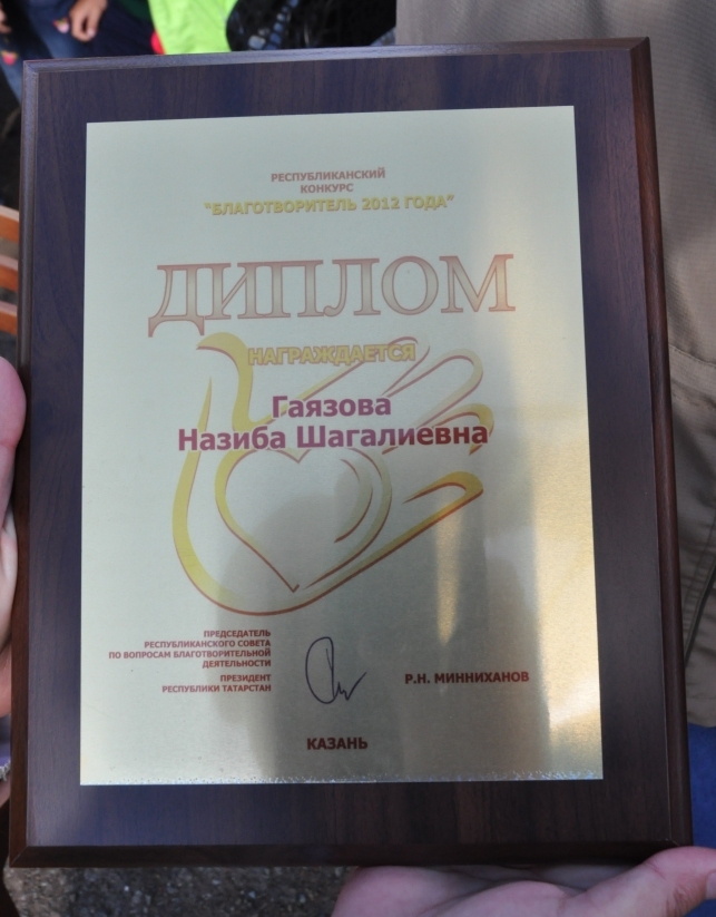 Районыбызның иң хөрмәтле кешеләреннән берсе Нәҗибә Шагали кызы Гаязова “Ел хәйриячесе - 2012” республика конкурсында җиңеп чыккан иде. Ул һәрвакыт аз керемле гаиләләрдә тәрбияләнүче балаларга ярдәм итә. ”Мәктәпкә әзерләнергә булыш” акциясендә теләп катнаша. Нәҗибә Гаязовнага әлеге дипломны муниципаль район Башлыгы вазифаларын башкаручы Фаил Камаев 27 август көнне Игелек үзәге каршында үткән бәйрәмдә тапшырды.
