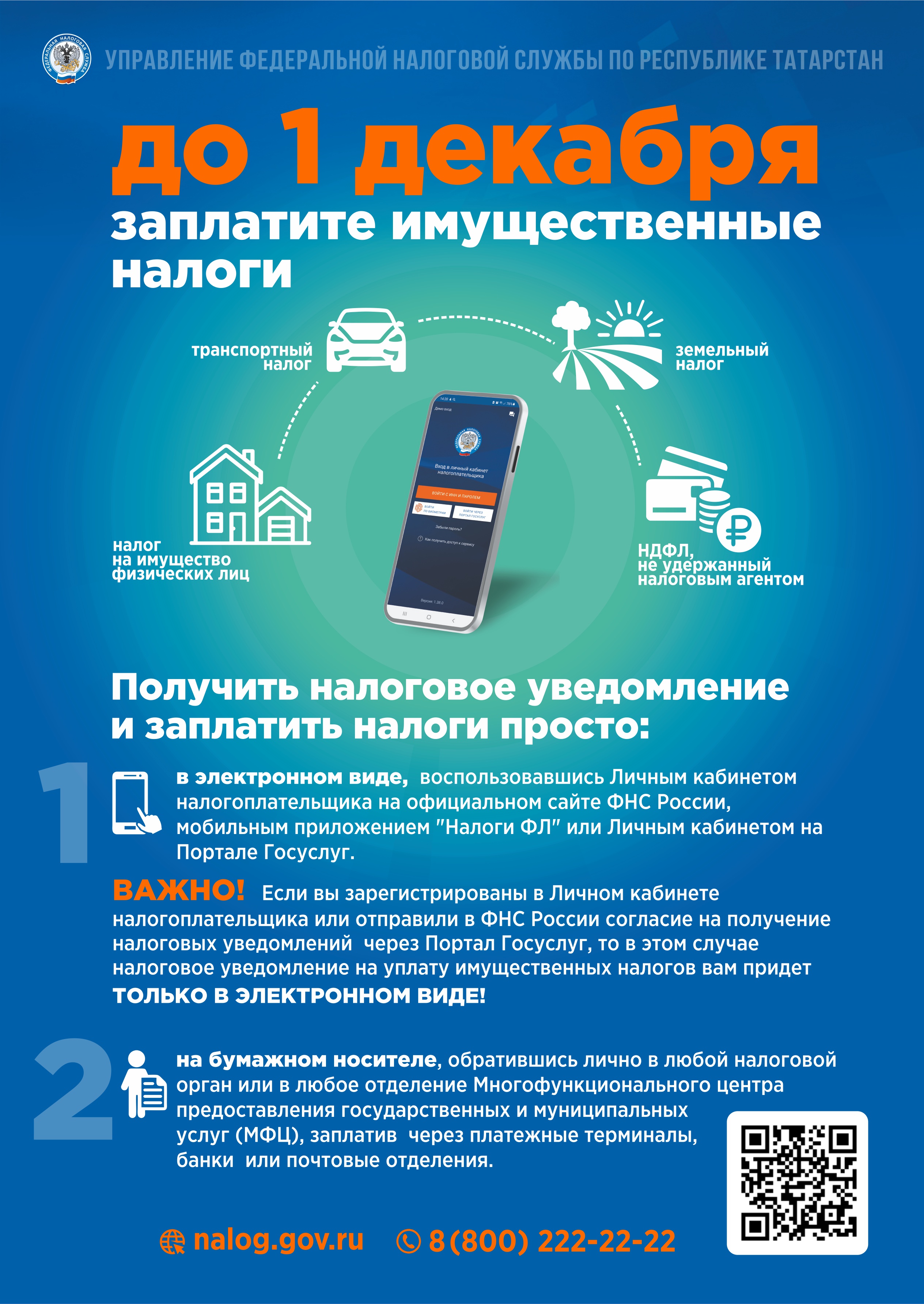 Физик затларның милкенә салымны ел саен салым чоры тәмамланганнан соң киләсе елның 1 декабреннән дә соңга калмыйча түләргә кирәк. Ягъни 2023 елның 1 декабренә кадәр 2022 ел өчен салым түләргә кирәк. Милектәге күчемсез милеккә салым салына торак йорт, фатир, бүлмә, гараж, машина-урын, төзелеп бетмәгән объектлар һ.б. салым салына. салым салу объектларының тулы исемлеге РФ НК 401 маддәсендә күрсәтелгән. "Әгәр салым түләүче вакытында түләмәсә, аңа штраф салыначак. Штрафтан тыш, түләүне кичектергән өчен салым түләүчегә пеня исәпләнә.