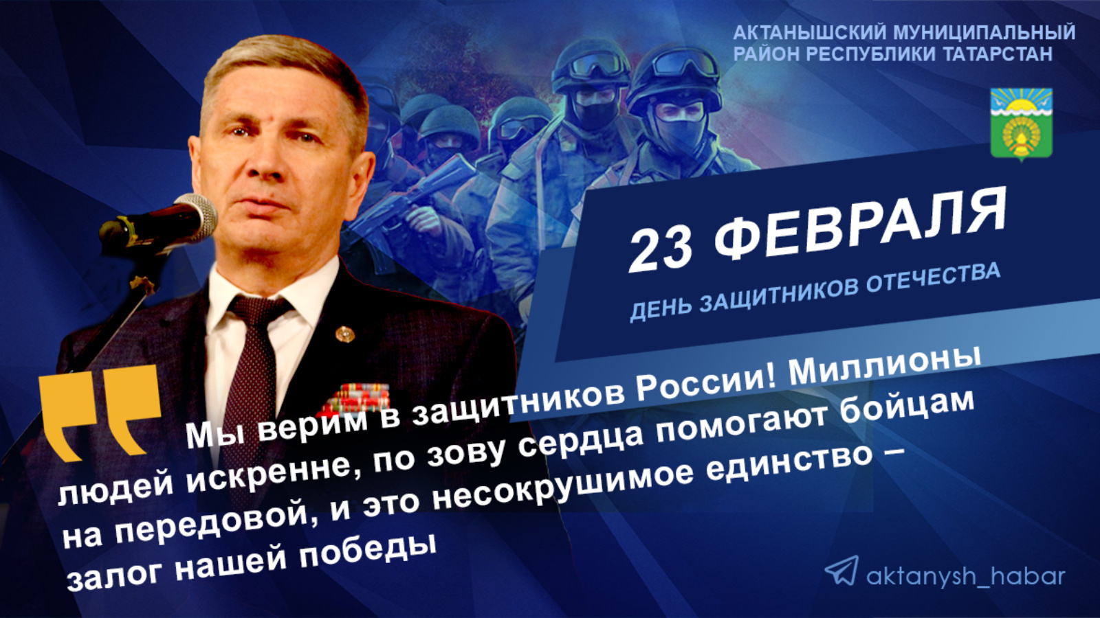 Хөрмәтле райондашлар, ир-егетләребез! Сезне ихлас күңелдән Ватанны саклаучылар көне белән тәбрик итәм! 23 февраль ул – батырлык, намус hәм кыюлык бәйрәме. Без бүген Бөек Ватан сугышында тиңдәшсез батырлыклар күрсәткән ветераннарыбыз алдында хөрмәт белән баш иябез, туган илне саклап, интернациональ бурычларын үтәп шәһит киткән райондашларыбызның якты истәлекләрен яңартабыз, илебез тынычлыгы өчен, бүген, неонацизм белән көрәшкән асыл егетләребезгә иң җылы теләкләрне юллап, исән-имин әйләнеп кайтуларын телибез. Бүген без, хәрби хезмәткәрләр белән бөтен авырлыкларны уртаклашкан һәм алар өчен ышанычлы тыл булып торган хәрбиләребезнең туганнарына, якыннарына һәм волонтерларыбызга аерым рәхмәт сүзләрен җиткерәбез. Егетләребезгә ярдәм итү, якыннары турында кайгырту – безнең төп бурычларның берсе. Ватанны саклаучылар көне белән котлап, Сезгә сәламәтлек, рухи көч, гаилә бәхете, шатлык-куанычлар һәм ил-көннәребезнең тыныч, имин, күгебезнең аяз булуын телим! Бәйрәм белән!