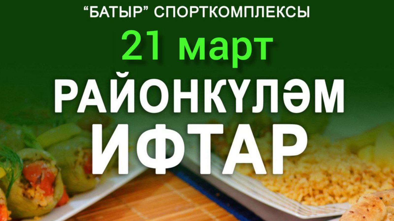 Районкүләм ифтар, быел 21 март көнне 17:00 сәг. “Батыр” спорт комплексында узачак. Һәрелдагыча, ураза тотучы райондашларыбыз биредә җыелып вәгазь тыңлаячак, бергәләп авыз ачу һәм җәмәгать белән ахшам намазы уку булачак. Һәркем үз намазлыгын алып килсә яхшы булыр иде.