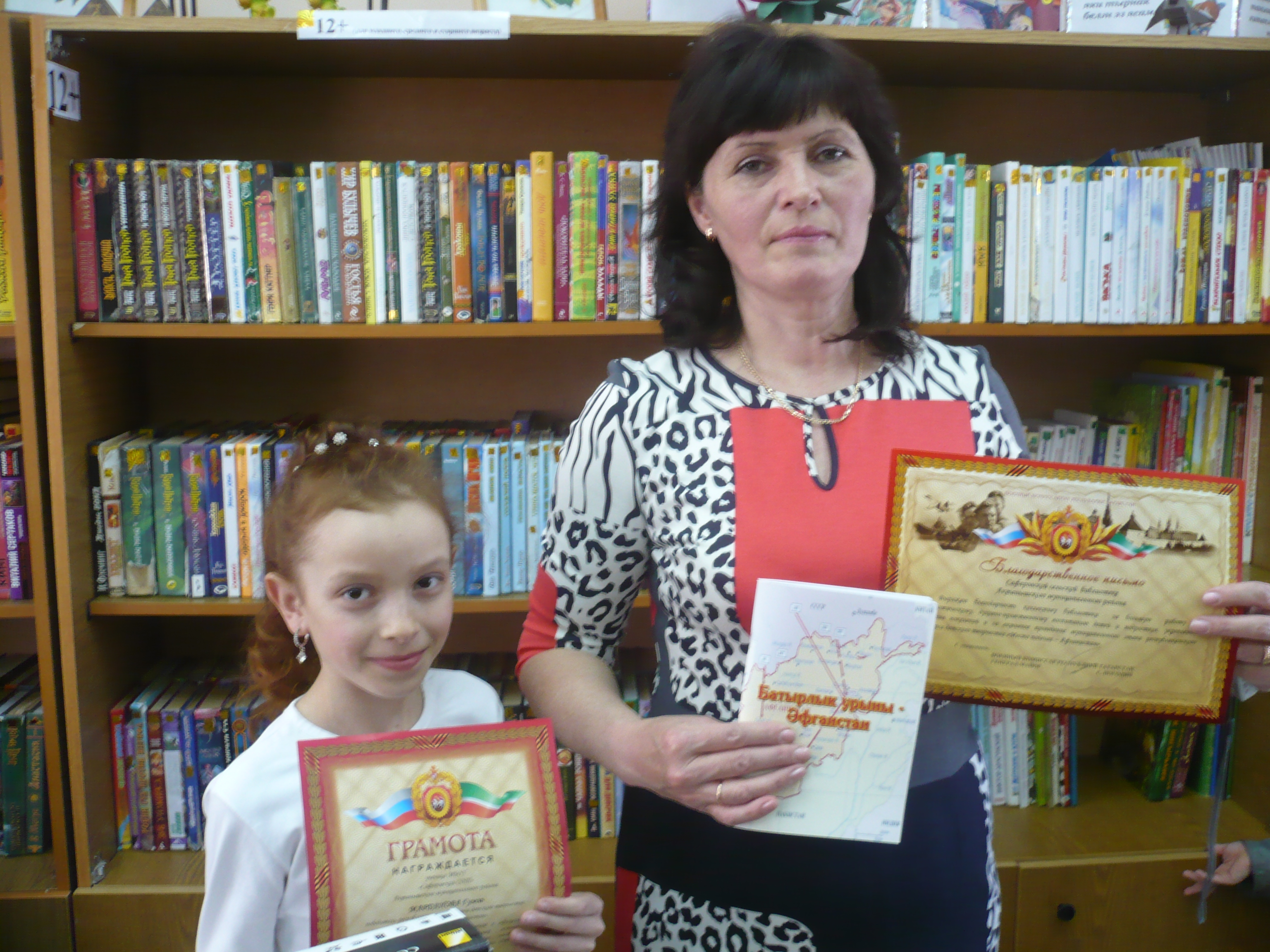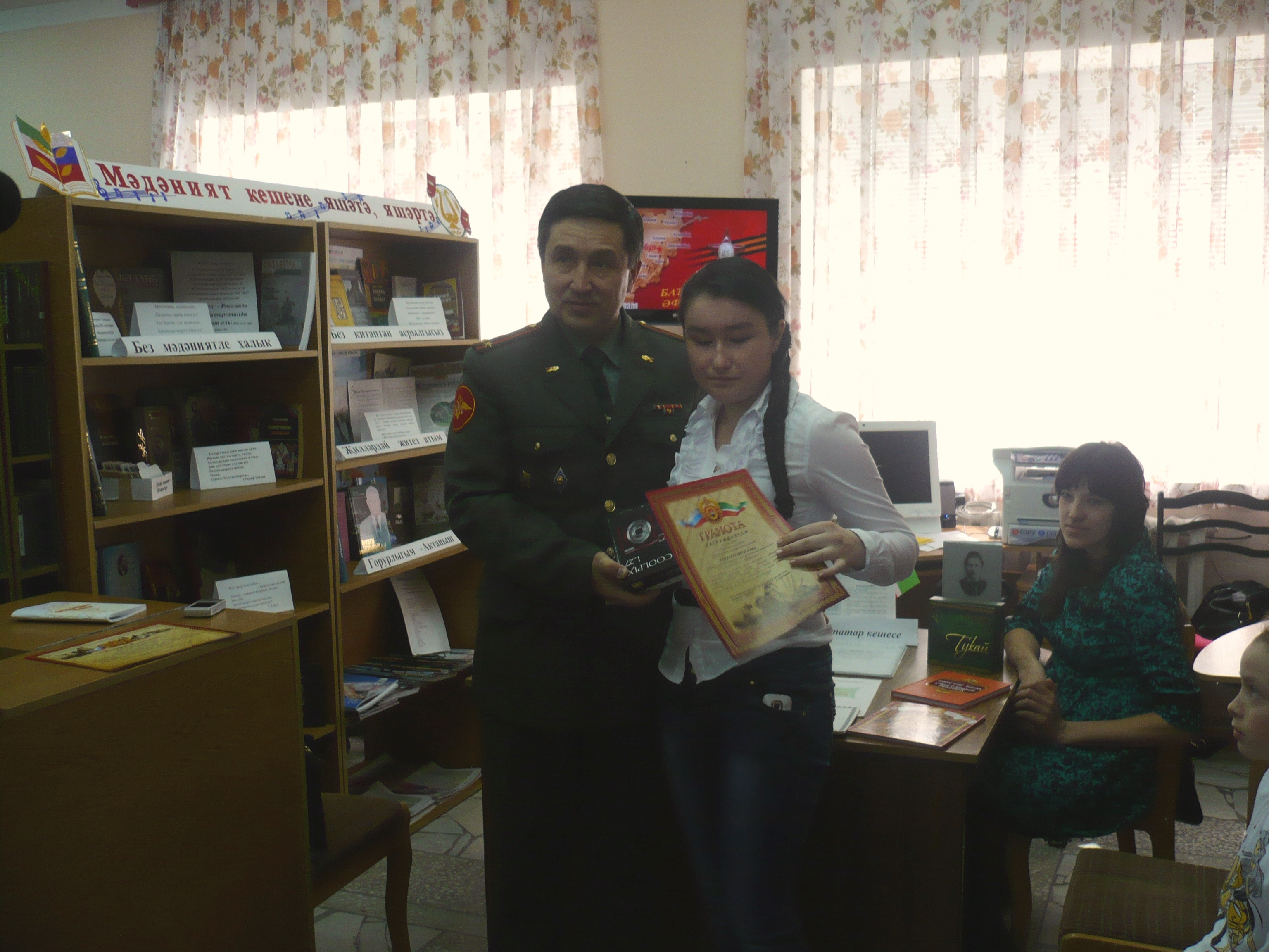Татарстан Республикасы Хәрби комиссариатының мактау грамотасы һәм кыйммәтле бүләкләренә Иске Сәфәр авылыннан Гүзәл Марданова һәм Яңа Әлем авылыннан Алисә Ахмадуллиналар лаек булды. Шулай ук Хәрби комиссариатның мактау кәгазе белән конкурсны оештырган Актаныш үзәк балалар китапханәсе, укучыларны конкурска әзерләгән Яңа Әлем һәм Иске Сәфәр авыл китапханәләре бүләкләнде.
