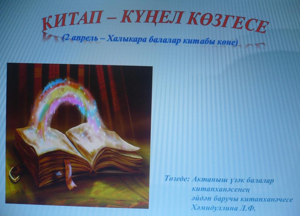 Бүген , 2 апрель көнне, Актаныш үзәк балалар китапханәсендә, Халыкара балалар китабы көне уңаеннан кичә булып узды. Бәйрәмдә Актаныш беренче санлы мәктәбенең 1"г" сыйныф укучылары (сыйныф җитәкчесе Зәһинә Долгова) катнашты. Бәйрәм барышында балаларга бу көнне бөек әкиятче, Дания язучысы Г.Х.Андерсенның дөньяга килүе, еллар узгач, нәкъ шул көн Халыкара балалар китабы көне итеп билгеләп үтелүе турында аңлатылды.