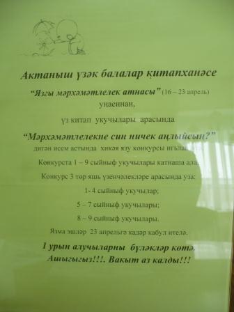 Актаныш үзәк балалар китапханәсе, “Мәрхәмәтле Татарстан. Язгы мәрхәмәтлелек атнасы” акциясе кысаларында үз китап укучылары арасында “Мәрхәмәтлелек!” Бу сүз нәрсә аңлата?”дигән исем астында иншалар конкурсы игълан итте.