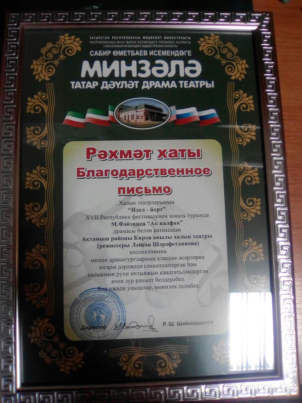 29 март көнне Киров халык театры М.Фәйзинең "Ак калфак" драмасы белән Идел-йорт регионара фестиваленең Минзәлә зонасында чыгыш ясады. Алар бик уңышлы чыгыш ясап тамашачыны таң калдырдылар. Киров халык театрын инде яратып өлгергән тамашачы залны тутырып килеп артистларыбызны алкышларга һәм чәчәкләр күмделәр. Жюри составының спектакльне яхшы бәяләве, ят төрле декорациягә уңай фикер әйтүләре Киров халык театры артистларын тагы да бәхетле итте. Халык театрыбызга киләчәктәдә шулай бердәм булып сәламәт булып эшләргә язсын.