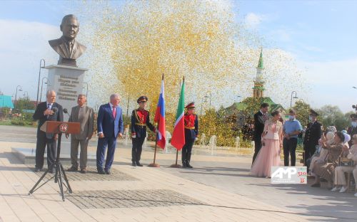 Россия Федерациясе Президенты Указы белән Герой яки хезмәт Герое исеме бирелгән затка аның Ватанында бронза бюст куелырга тиеш. Бүгенге бюст ачу тантанасында Рөстәм Миңнеханов һәм РФ Президентының Идел буе федераль округындагы Тулы вәкаләтле вәкиле урынбасары Игорь Паньшин катнашты.