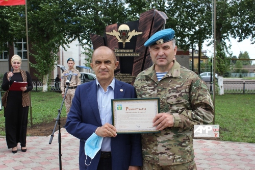 Җиңү паркында бүген Һава-десант гаскәрләре сугышчыларына рәсми төстә ачылган һәйкәл чәчәкләргә күмелде. Флүн Кадыйров һәм Камил Мокыймов десантчылар символы рәвешендә ясалган венокны урнаштырганнан соң, һәйкәлгә кызыл канәферләр салынды.