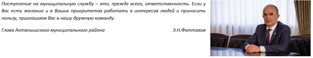 Вся необходимая информация о муниципальной службе Республики Татарстан и в Актанышском муниципальном районе для Вашего удобства сгруппирована в нижеприведённых разделах. По ссылке «Поступление на службу» доступна информация о квалификационных требованиях, конкурсных процедурах, объявленных конкурсах, кадровом резерве и многом другом. Раздел «Прохождение службы» содержит сведения о порядке присвоения классных чинов, аттестации, служебной культуре, наградах и др. Ознакомиться с нормативной базой, регулирующей отношения на государственной гражданской службе, можно в разделе «Нормативно-правовые акты и иные документы». Вся информация о системе стажировочных площадок в органах власти Татарстана размещена в соответствующем разделе. |